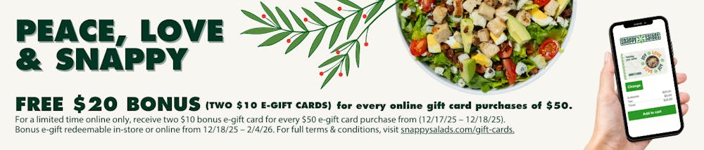 *Buy a $50 E-Gift Card Get $20 Bonus (Two $10 Bonus Cards) Terms & Conditions: During the Distribution Period (12/17/25-12/18/25), receive two $10 e-gift promotional certificates worth $20 for every $50 spent on an e-gift card. The promotional certificate is valid for redemption in-store or online at snappysalads.com or Snappy Salads Rewards app from 12/18/25 – 2/4/26. Cannot be redeemed on the day of gift card purchase. Void where prohibited by law. No cash value. For promotional purposes only. Promotional certificate is not valid towards gift card purchases, catering, or third-party ordering sites. Valid at participating restaurants only (excludes airports). No stored value. Promotional certificate may be redeemed one (1) time and must be surrendered in-store at time of redemption. Excludes tax and gratuity. Cannot be duplicated, reprinted, or combined with any other offer, discount, or promotion. Enjoy!