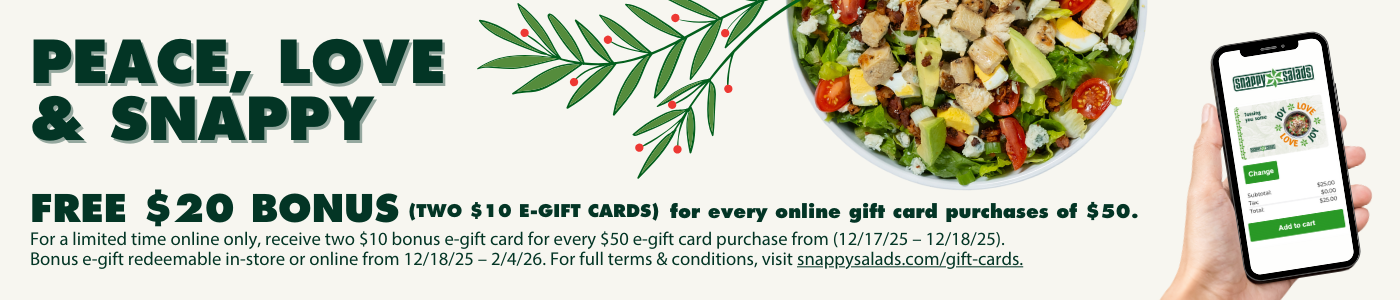 *Buy a $50 E-Gift Card Get $20 Bonus (Two $10 Bonus Cards) Terms & Conditions: During the Distribution Period (12/17/25-12/18/25), receive two $10 e-gift promotional certificates worth $20 for every $50 spent on an e-gift card. The promotional certificate is valid for redemption in-store or online at snappysalads.com or Snappy Salads Rewards app from 12/18/25 – 2/4/26. Cannot be redeemed on the day of gift card purchase. Void where prohibited by law. No cash value. For promotional purposes only. Promotional certificate is not valid towards gift card purchases, catering, or third-party ordering sites. Valid at participating restaurants only (excludes airports). No stored value. Promotional certificate may be redeemed one (1) time and must be surrendered in-store at time of redemption. Excludes tax and gratuity. Cannot be duplicated, reprinted, or combined with any other offer, discount, or promotion. Enjoy!