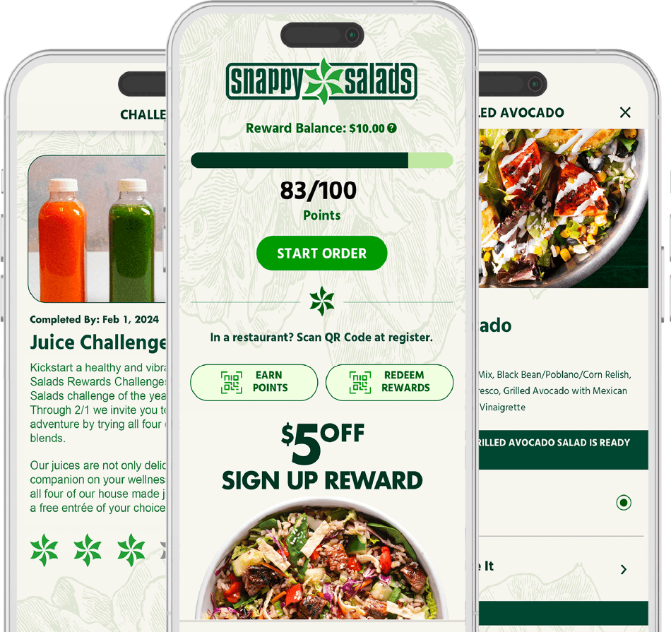*Rewards Terms & Conditions: Points are only earned after you download the app or create an account online and make a purchase associated with your Snappy Salads Rewards account – no retroactive points for any visits made before joining the program are given. Rewards dollars expire after 365 days without account activity. Manual point adds are subject to validation. Snappy Salads Catering is not included in the Snappy Rewards program and is not available to order on our Snappy Rewards app. Banked reward dollars are not applicable on catering orders and catering orders are not eligible to earn reward points. You cannot earn points on orders placed through any third-party service (like DoorDash and Uber Eats). You also don't earn points on tax, tips, gift card purchases. Gift Card purchases are not eligible to earn Rewards points. Rewards points are earned when logged into Rewards account and making a purchase with a Gift Card. Please see our full Rewards Terms & Conditions for more information.