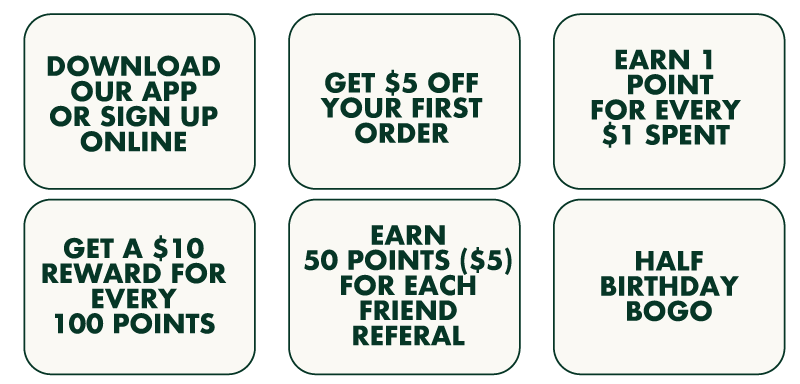For every $1 spent at Snappy Salads you’ll earn 1 point, and we’ll hook you up with a $10 reward for every 100 points to spend on any menu item you’d like.